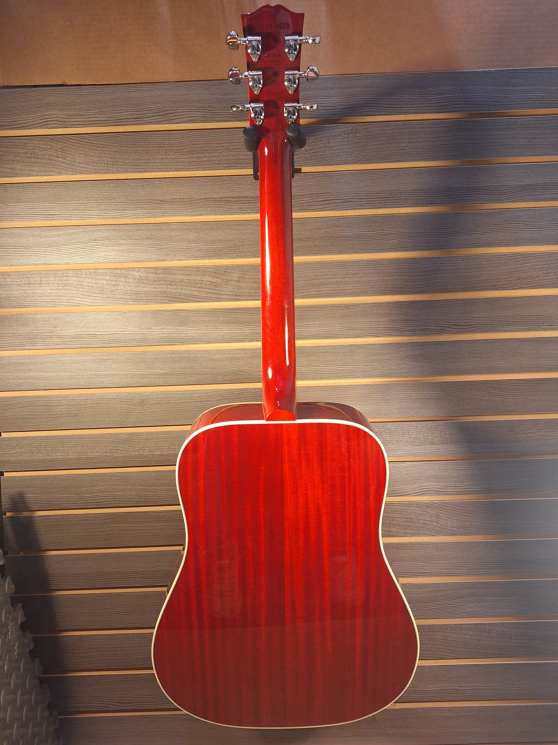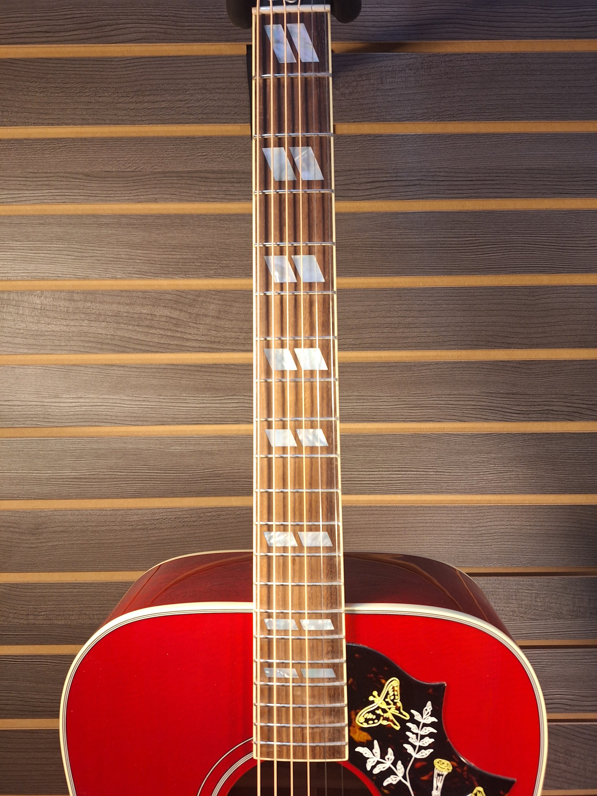 Much of the Hummingbird’s appeal lies in its versatility. No matter how you attack this flat-top, it pumps out rich, deep tones, and is equally at home strumming first-position chords as it is taking the spotlight for picking lead lines. Its spacious mahogany body and sweet, select Sitka spruce top are more than capable of nailing down the rhythm in the hands of a rock and roll sideman or accompanying the most nuanced performance under the fingers of today’s alternative singer-songwriter. The Hummingbird's mahogany neck has a comfortable rounded profile and mother of pearl parallelogram inlays. This 'bird has a TUSQ® nut, saddle, and bridge pins, Grover® Rotomatic® tuners, the iconic Hummingbird™ graphics on the pickguard, and is equipped with LR Baggs® VTC electronics, so it's ready to plug in on stage or in the studio. A Gibson hardshell case is included.